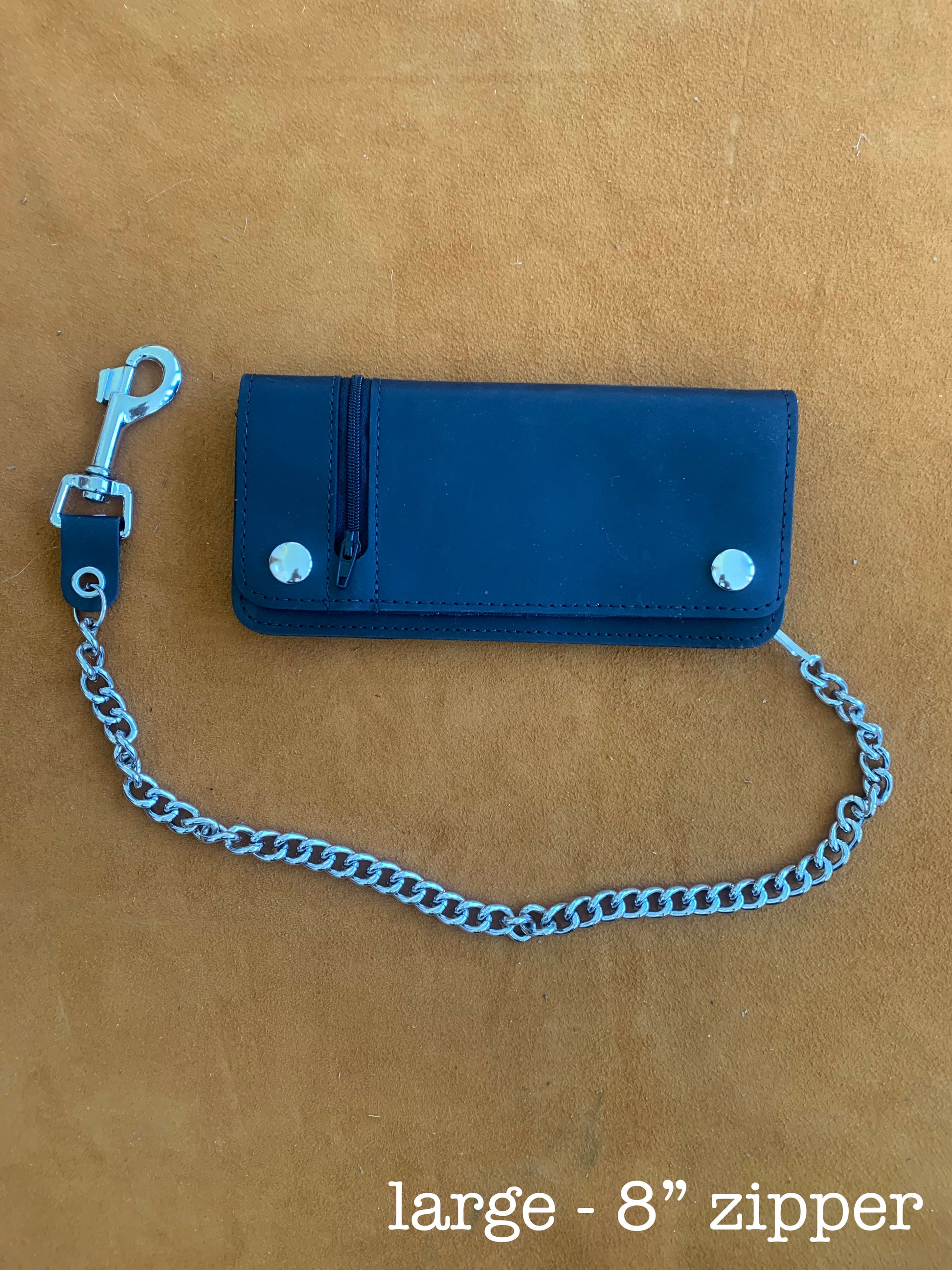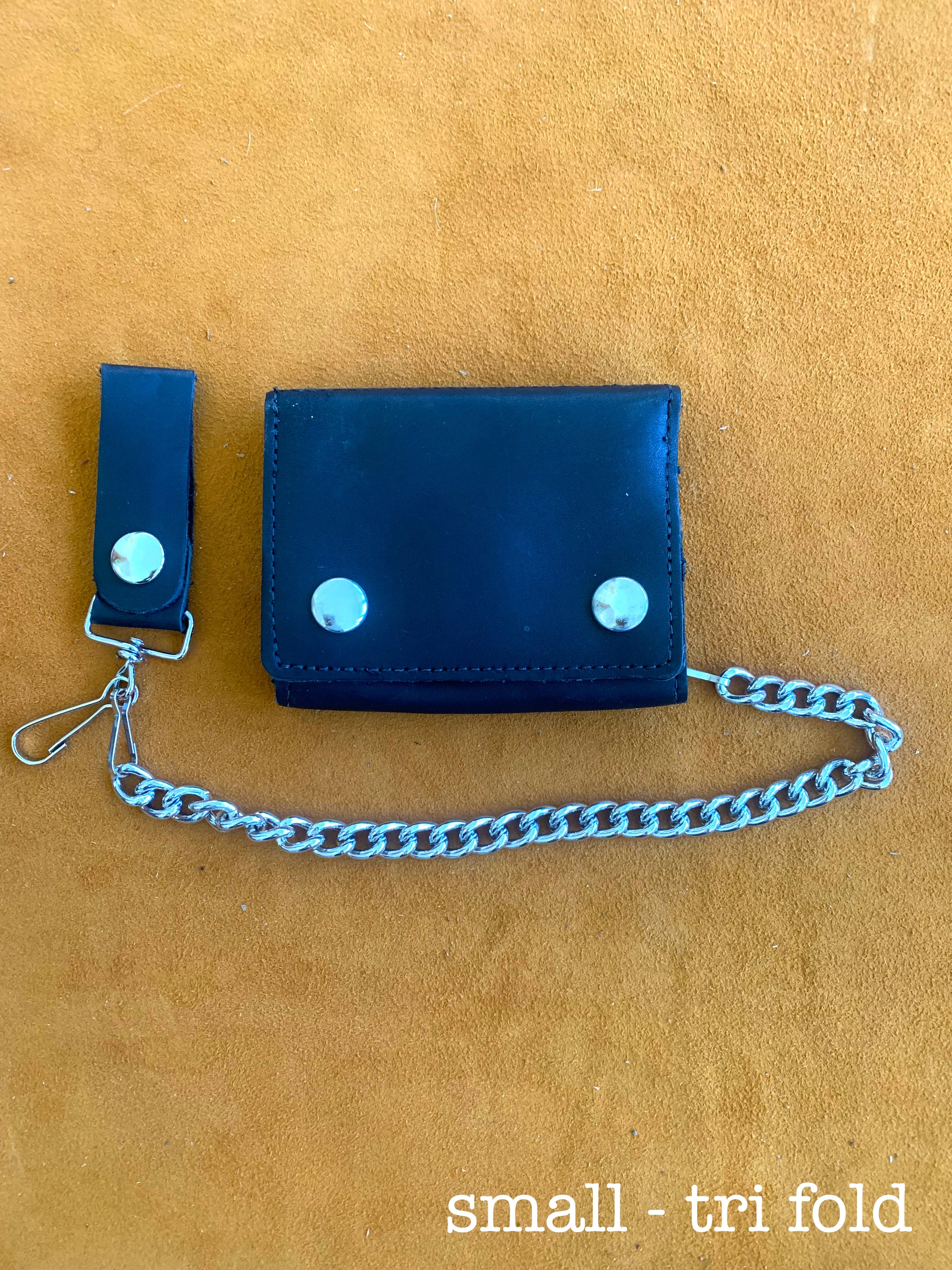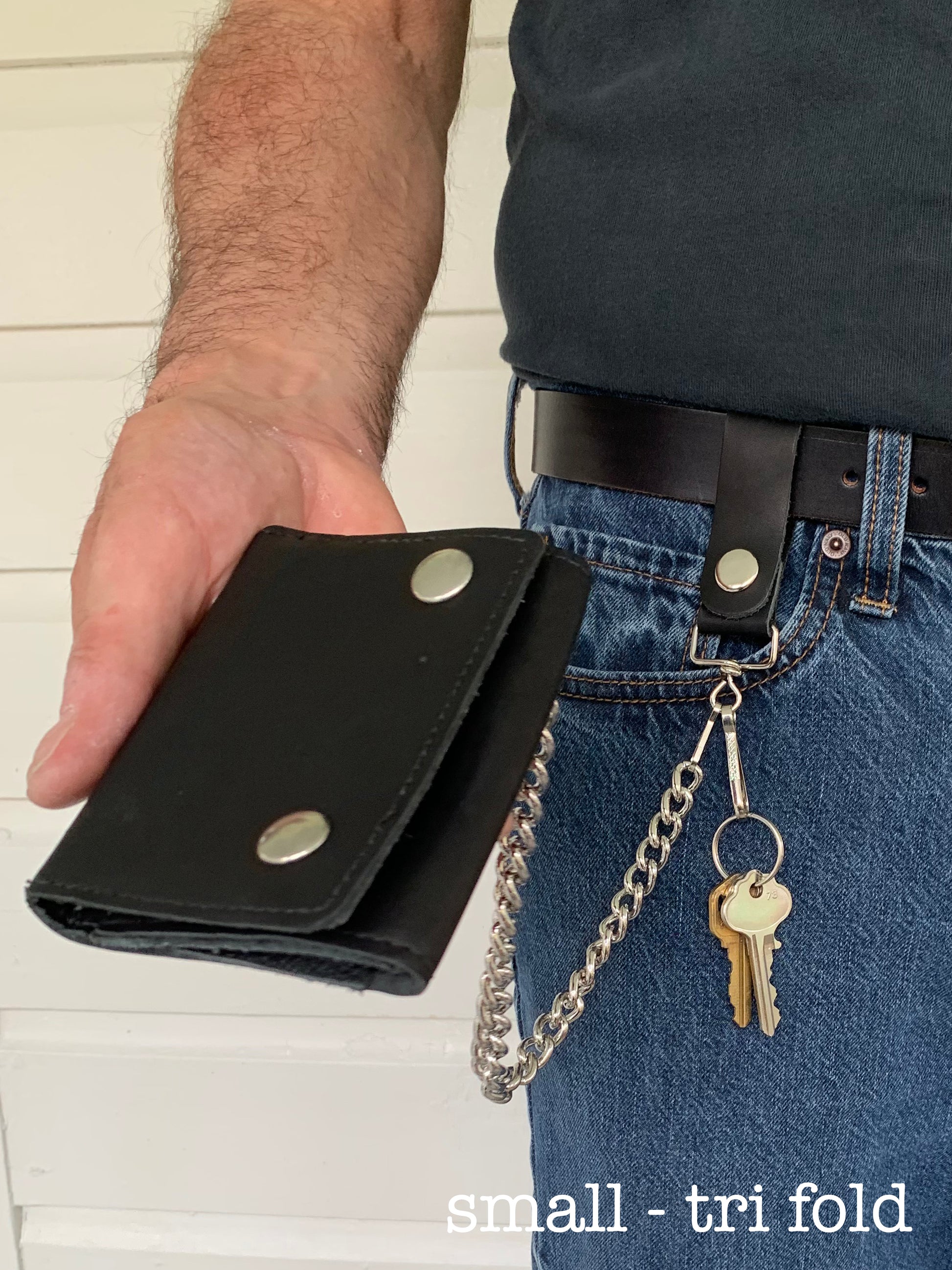You can't loose your wallet when it's chained to you. Our classic chain wallet comes in 3 handy sizes for all of your needs. Made from high quality, full grain cowhide with edge stitching for added durability. Lots of room for cash and sleeves for cards and photos. Hand-made from vegetable tanned solid leather.