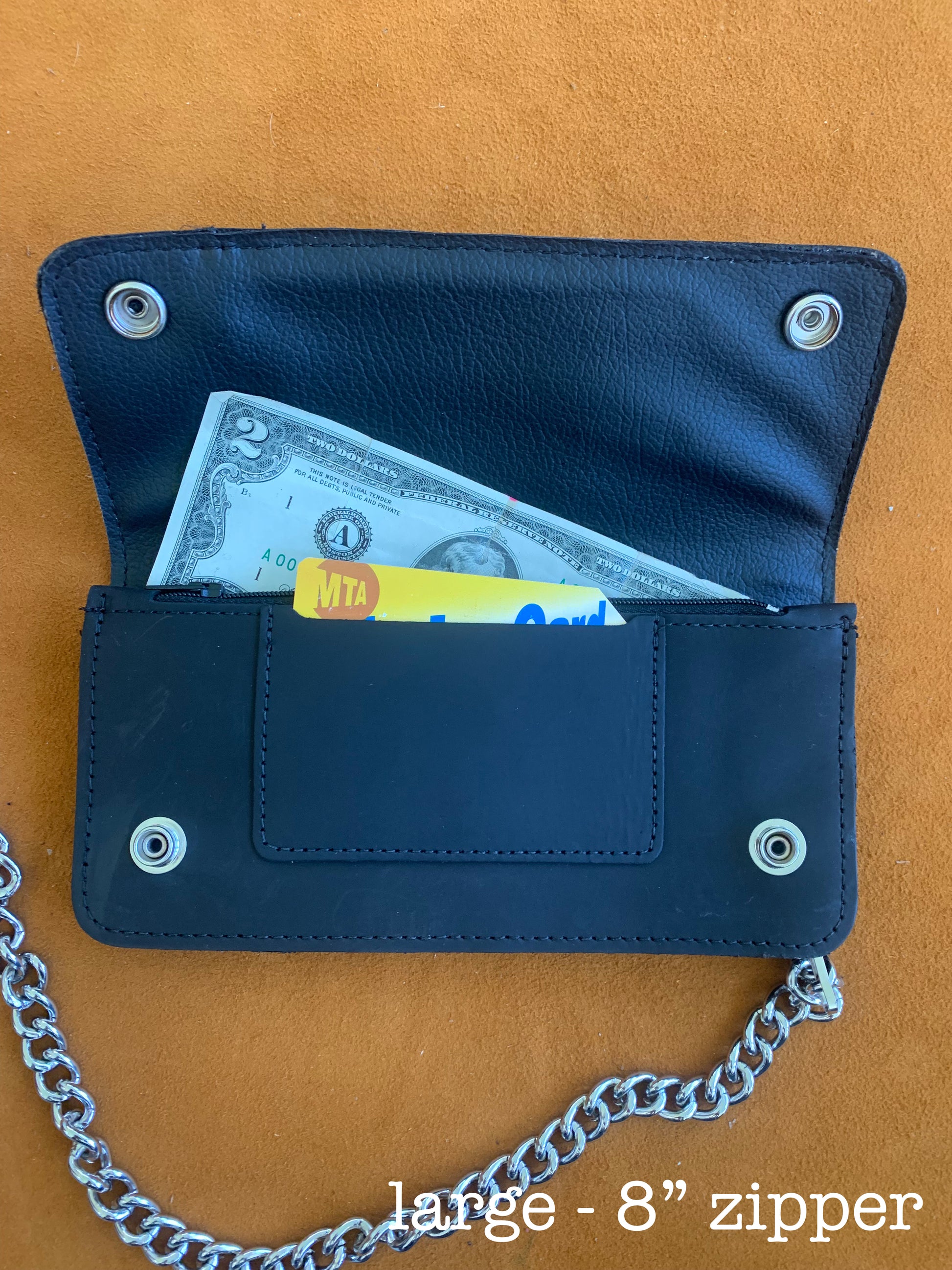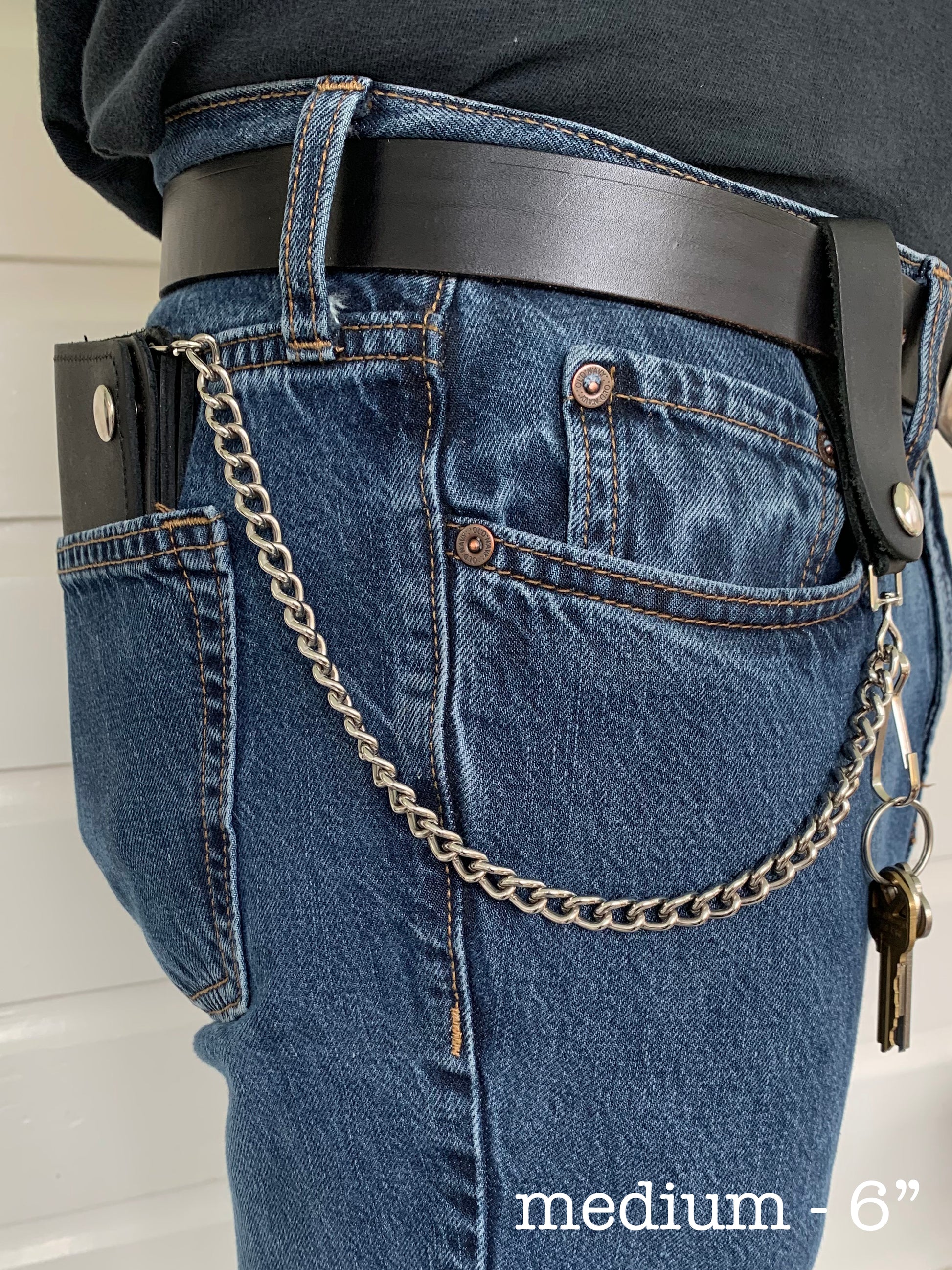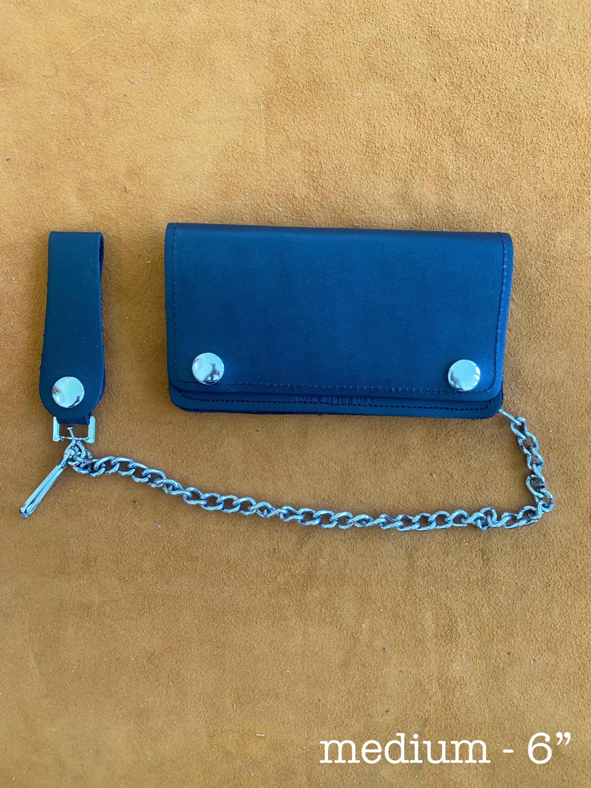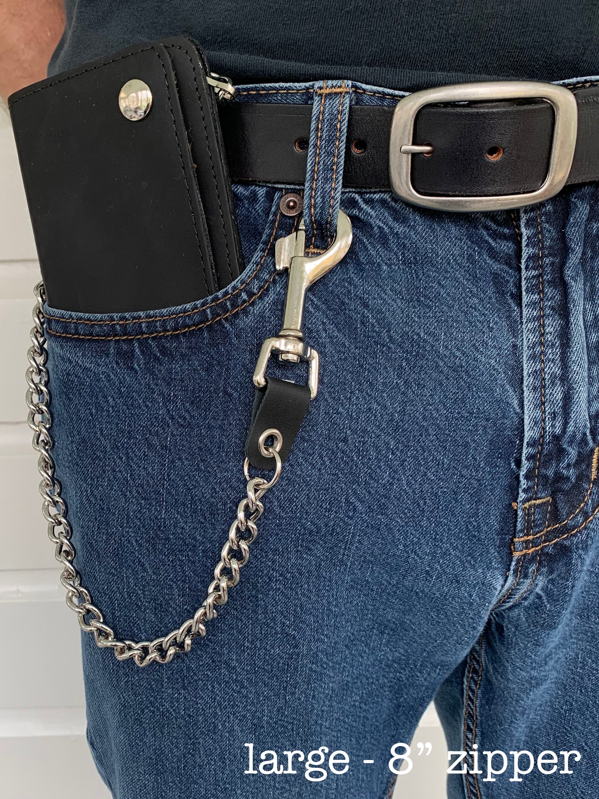 You can't loose your wallet when it's chained to you. Our classic chain wallet comes in 3 handy sizes for all of your needs. Made from high quality, full grain cowhide with edge stitching for added durability. Lots of room for cash and sleeves for cards and photos. Hand-made from vegetable tanned solid leather.