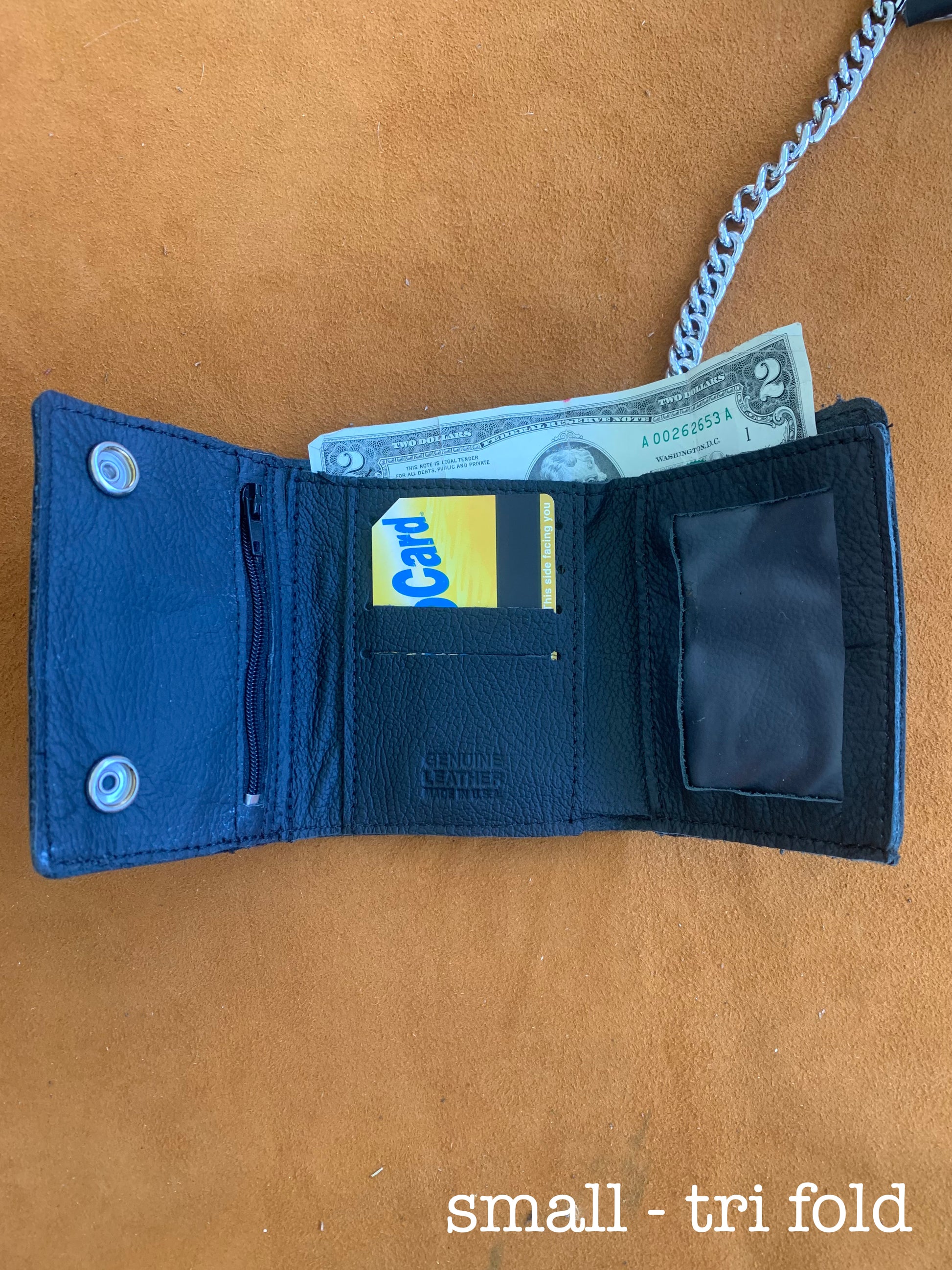 • Small Tri-Fold Wallet: 4.5"x3.25" closed and opens to 10.25" with a zipper pouch, pockets, vinyl sleeve and a key clip