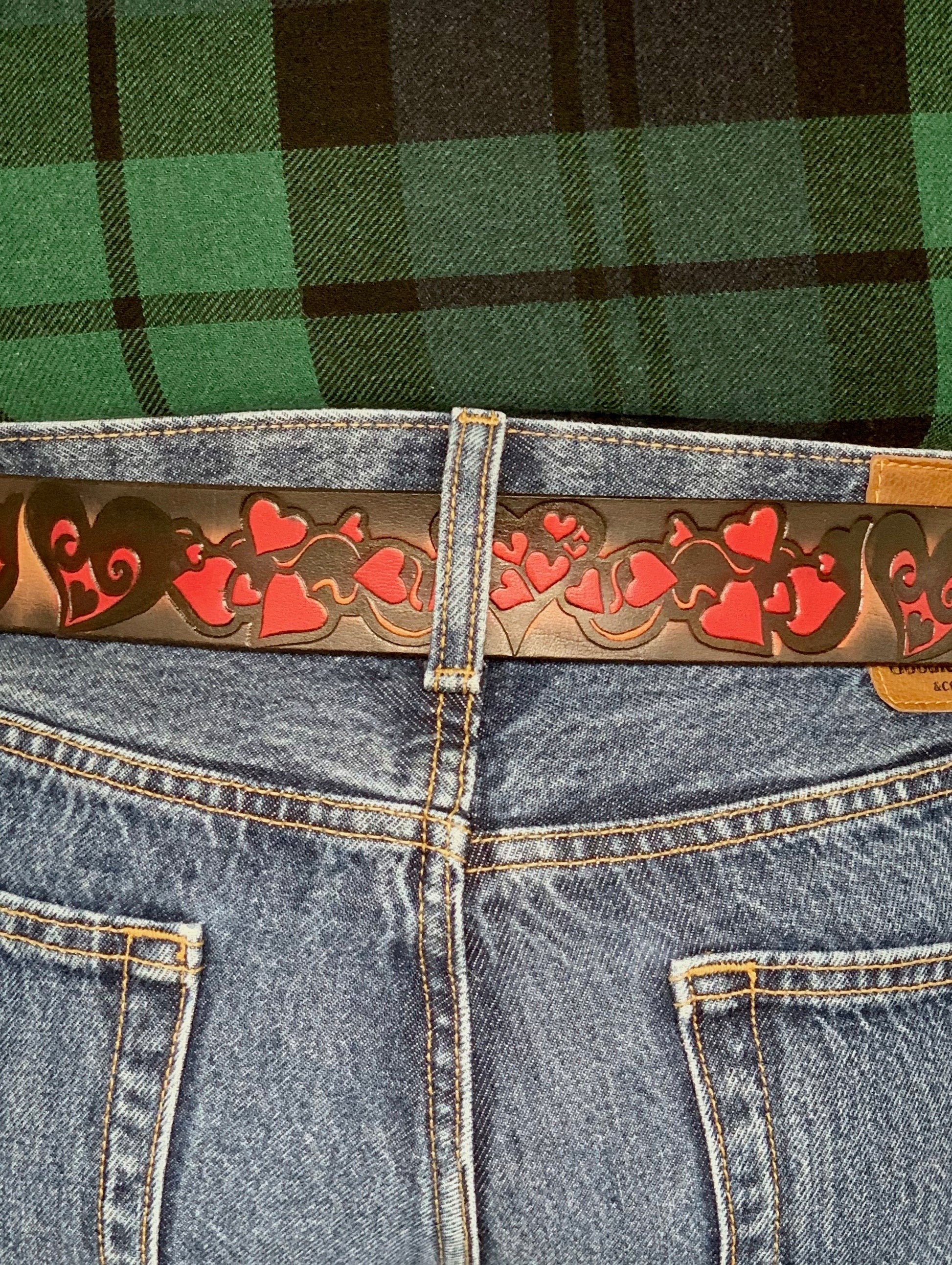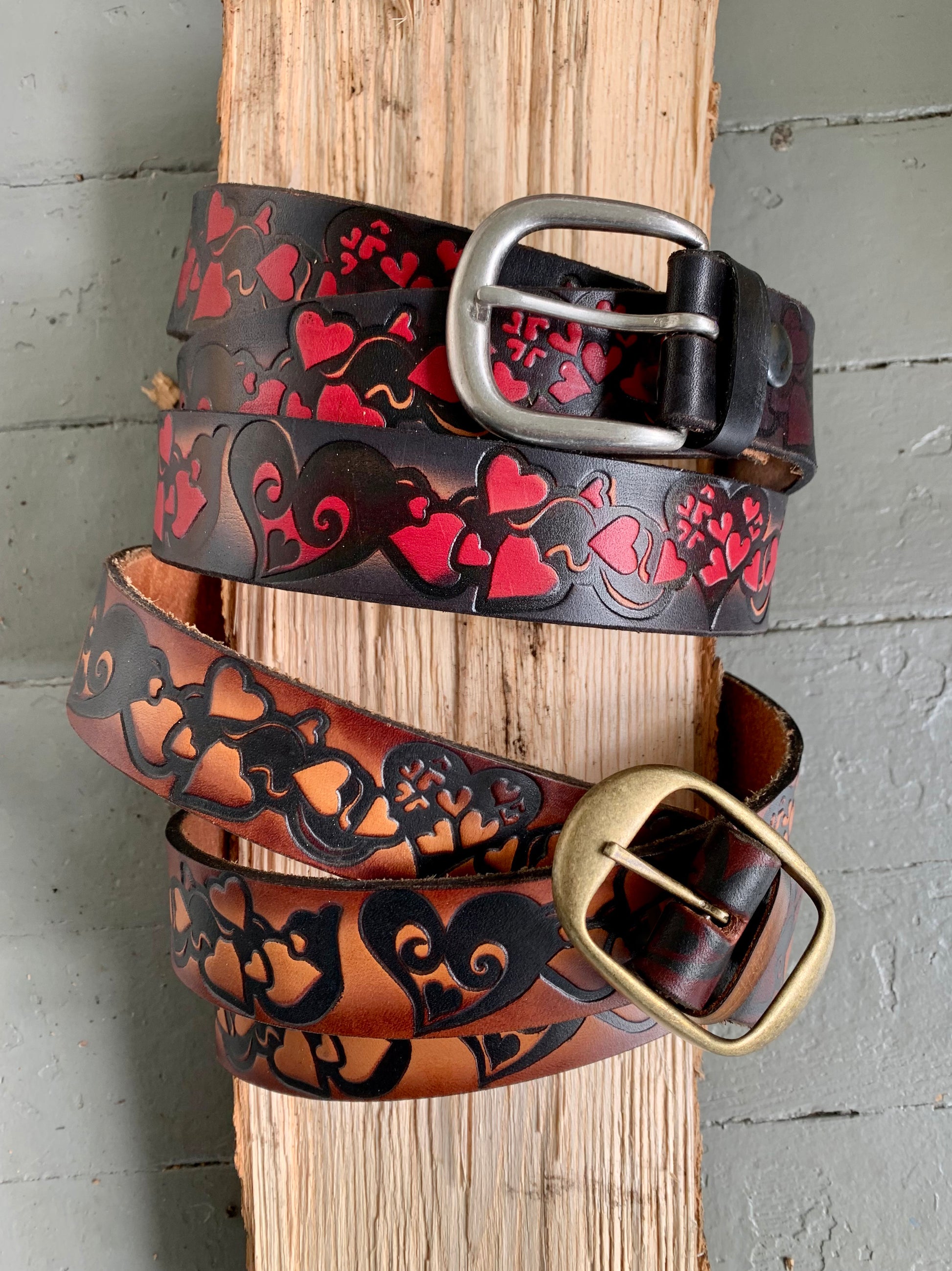 Looking for a belt you'll love? Then you'll heart this style. Our 1-1/2 inch wide solid leather hearts belt is available in 2 bold color ways. Choose waist size (even sizes 26"-64") and buckle style. Hand-made from top grain, vegetable tanned solid leather. Colors may vary.